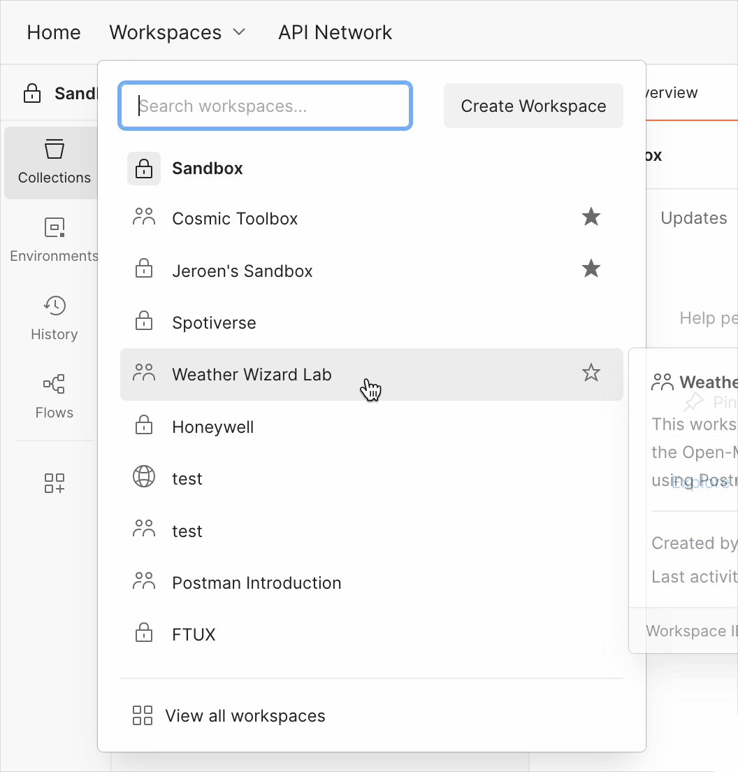 To address ambiguous naming, we introduced peek. Peek appears on hover anywhere a workspace name is shown and includes essential context: